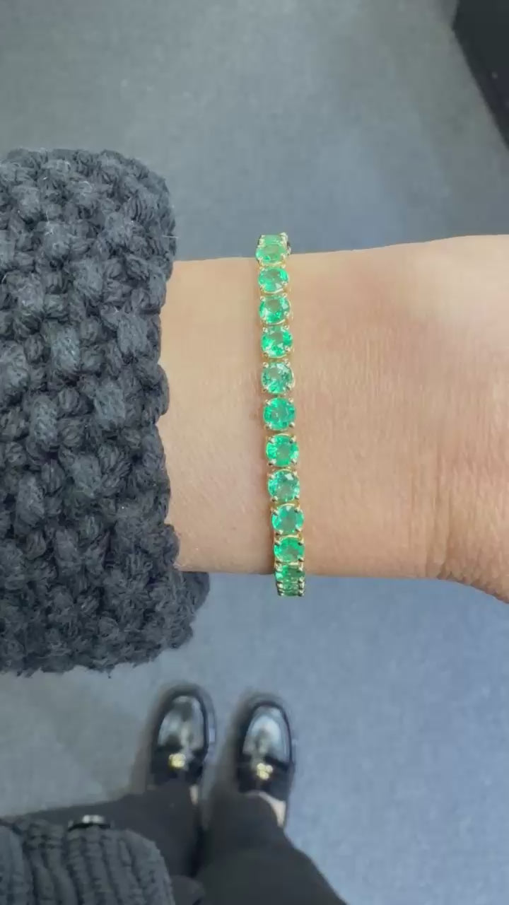 Adorn your wrist with timeless elegance in this luxurious tennis bracelet, meticulously crafted in solid 18K yellow gold and featuring a continuous, radiant line of vibrant green emeralds.